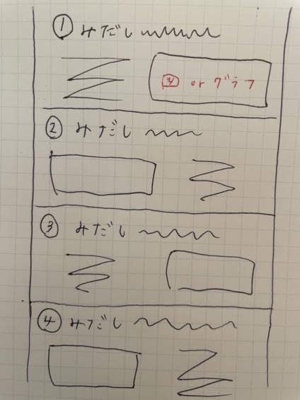 その場合、このイラストみたいに画像と本文の位置を交互に入れ替えると「視線の動き」が出ます。